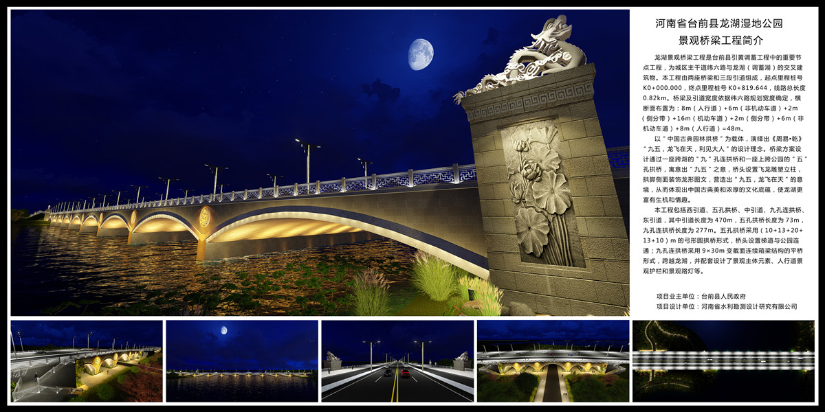 臺(tái)前縣龍湖濕地公園景觀橋梁工程是臺(tái)前縣引黃調(diào)蓄工程中的重要節(jié)點(diǎn)工程,也是龍湖生態(tài)風(fēng)景區(qū)的形象工程,為臺(tái)前縣新城區(qū)主干道——緯六路與龍湖及龍湖公園的交叉建筑物。橋梁依據(jù)緯六路規(guī)劃寬度確定總寬48m。工程由兩座橋梁和三段引道組成,線路總長(zhǎng)度0.82km,其中五孔圓拱橋跨越龍湖公園,長(zhǎng)度69m,采用(10+13+16+13+10)m圓弧拱形式,橋頭設(shè)置梯道與公園連通;九孔連拱橋跨越龍湖,長(zhǎng)度278m,采用9×30m的平橋形式,并配套設(shè)計(jì)了景觀主體元素、人行道景觀護(hù)欄和景觀路燈等。