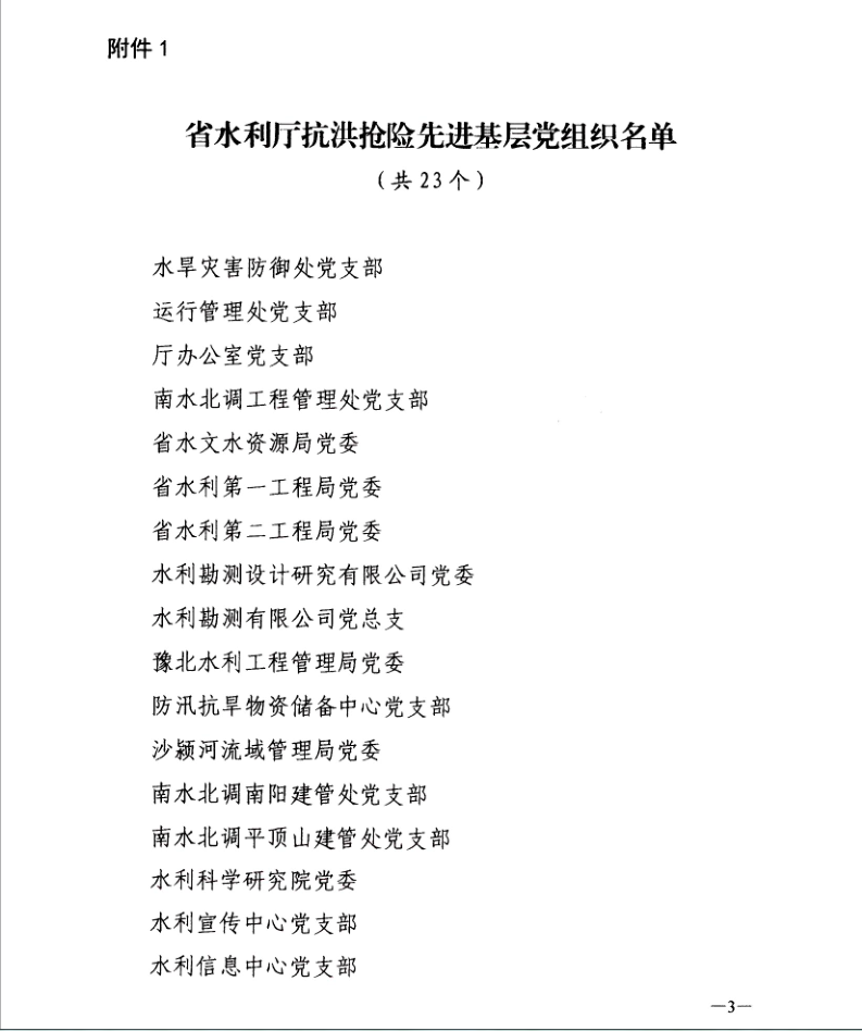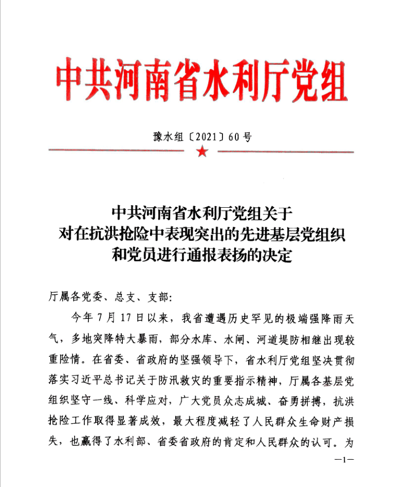 8月9日,省水利廳黨組以豫水組【2021】60號(hào)文下發(fā)了《關(guān)于對(duì)在抗洪搶險(xiǎn)中表現(xiàn)突出的先進(jìn)基層黨組織和黨員進(jìn)行表彰的決定》,公司黨委作為省水利廳抗洪搶險(xiǎn)先進(jìn)基層黨組織,翟淵軍、朱太山、趙廷華、楊華軍、王志軍、陳輝、張明恩、劉蘭勤等8名黨員同志作為省水利廳抗洪搶險(xiǎn)先進(jìn)黨員受到通報(bào)表?yè)P(yáng)。