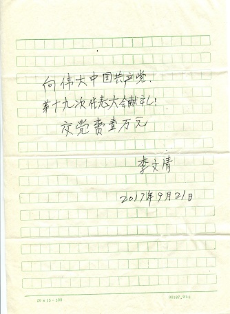 李文清同志,女,1929年5月出生,1952年參加工作以來,不論在什么工作單位和工作崗位,始終勤勤懇懇。任勞任怨,干一行愛一行,干好一行,多次被評(píng)為先進(jìn)工作者。 1980年8月到河南省水利勘測(cè)設(shè)計(jì)院任會(huì)計(jì),她認(rèn)真負(fù)責(zé),待人熱情,服務(wù)周到,受到同事的好評(píng)。她積極要求進(jìn)步,1956年就向黨組織遞交了入黨申請(qǐng)書,幾十年矢志不渝,1990年12月退休后,她堅(jiān)持理想信念,孜孜不倦的追求,于1995年3月光榮入黨。入黨后,她始終在政治上同黨中央保持高度一致,堅(jiān)信只有中國共產(chǎn)黨才能帶領(lǐng)全國各族人民走中國特色社會(huì)主義道路,實(shí)現(xiàn)全面小康和國家富強(qiáng)。她關(guān)心國家大事,關(guān)心單位發(fā)展,深感為黨工作太少,為了表達(dá)對(duì)黨的深厚感情,2011年“七一”前夕,為慶祝建黨90周年,一次性向組織交納黨費(fèi)9999元;2016年6月16日,她用樸實(shí)無華的語言給黨組織寫了“我要給偉大的中國共產(chǎn)黨過生日”,向組織繳納黨費(fèi)2000元;2017年9月22日,在黨的十九大即將召開之際,88歲高齡的她平時(shí)省吃儉用,又一次從每月3000多元的退休金里積攢了10000元作為特殊黨費(fèi),向黨的十九大獻(xiàn)上自己的一份厚禮,祝賀黨的十九大勝利召開,祝愿我們的黨在以習(xí)近平同志為核心的黨中央集體領(lǐng)導(dǎo)下,實(shí)現(xiàn)兩個(gè)一百年的宏偉目標(biāo),實(shí)現(xiàn)偉大的中國夢(mèng)。