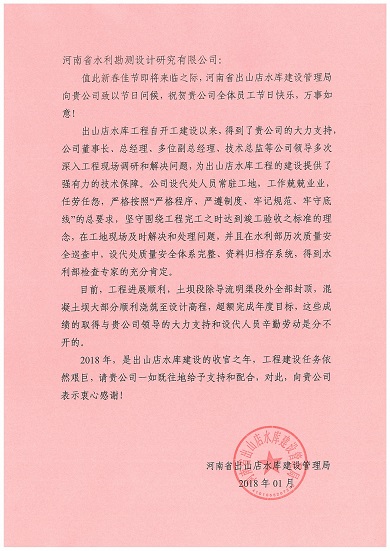 1月23日,公司收到河南省出山店水庫建設(shè)管理局發(fā)來的感謝信,對公司在工程建設(shè)中作出的貢獻表示感謝。