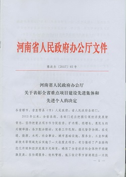 8月16日,河南省人民政府辦公廳發(fā)布《關(guān)于表彰全省重點項目建設(shè)先進集體和先進個人的決定》 [豫政辦〔2017〕92號]文件,對鄭州城建集團投資有限公司等40個先進集體和賈要偉等114名先進個人予以表彰,設(shè)計公司被評為全省重點項目建設(shè)先進集體。全文內(nèi)容如下: