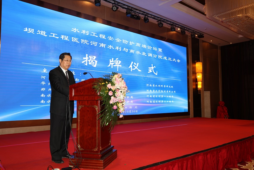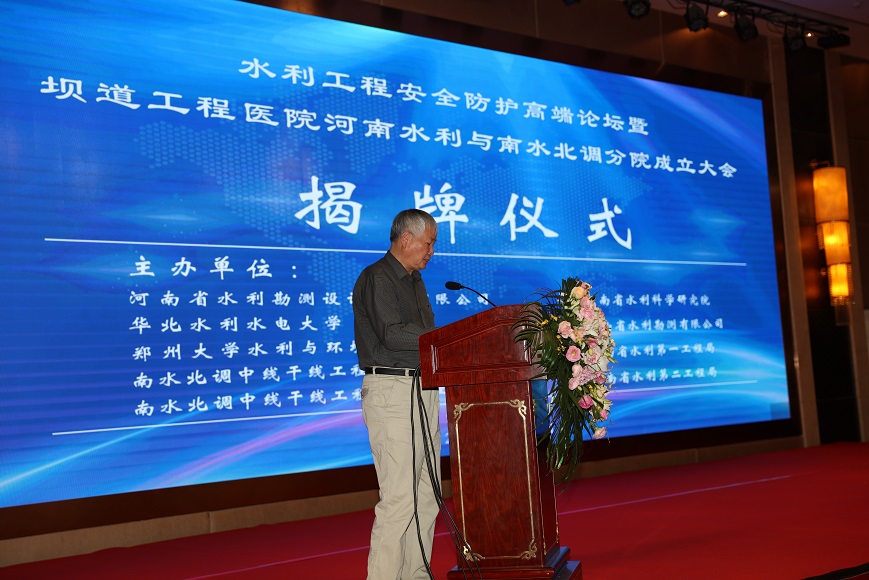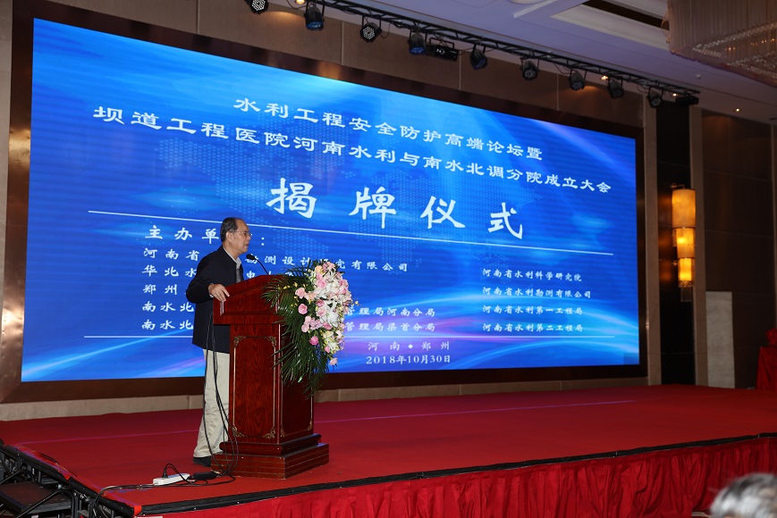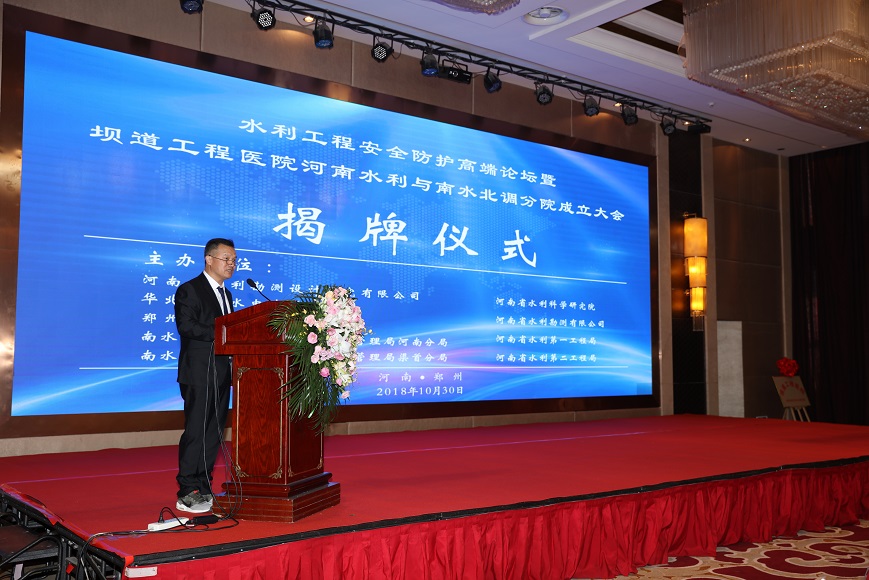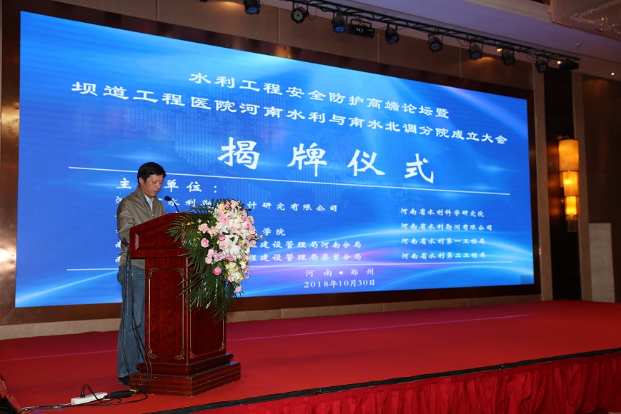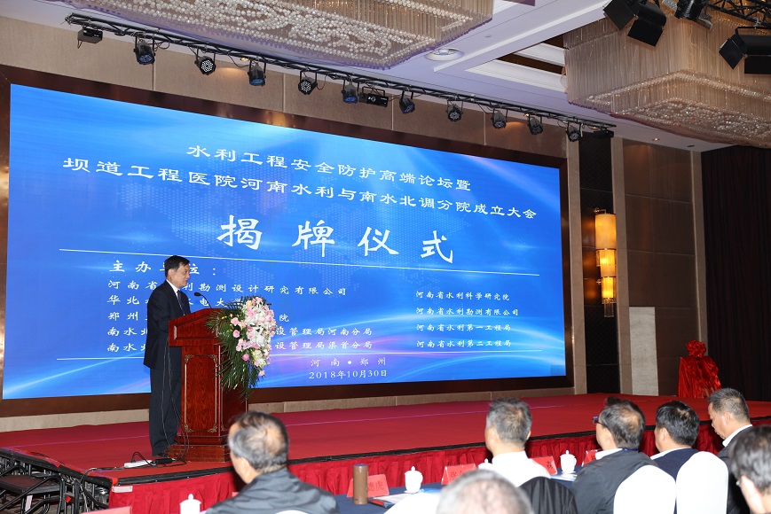 2018年10月30日上午,水利工程安全防護(hù)高端論壇暨壩道工程醫(yī)院河南水利與南水北調(diào)分院成立大會(huì)在鄭州天鵝城國(guó)際飯店隆重召開(kāi)。中國(guó)工程院王家耀院士、王復(fù)明院士等來(lái)自40多家單位的領(lǐng)導(dǎo)、嘉賓200多人參會(huì)。會(huì)議開(kāi)幕式由河南省水利勘測(cè)設(shè)計(jì)研究有限公司翟淵軍董事長(zhǎng)主持,華北水利水電大學(xué)劉文鍇校長(zhǎng)致歡迎辭,相關(guān)領(lǐng)導(dǎo)講話,王復(fù)明院士介紹了《壩道工程醫(yī)院建設(shè)進(jìn)展》,會(huì)議舉行了揭牌儀式和高端論壇。
