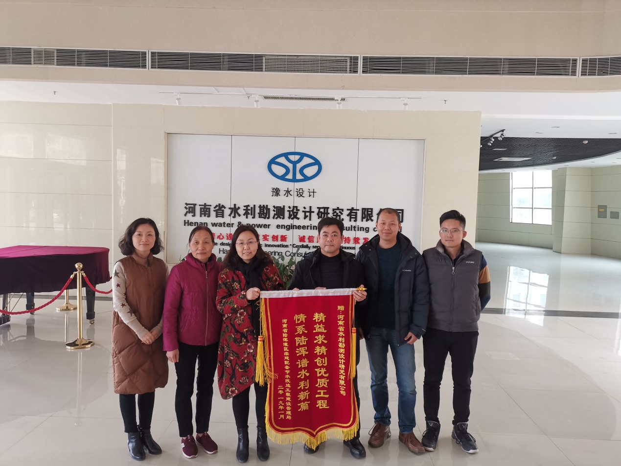 2019年1月8日,河南省陸渾灌區(qū)續(xù)建配套節(jié)水改造工程建設(shè)管理局(以下簡稱“建管局”)局長李付長、副局長段笑暉等一行人專程為我公司送來感謝信及錦旗,對公司及陸渾灌區(qū)項目組成員積極、努力、認(rèn)真、負(fù)責(zé)的設(shè)計工作給予了充分的肯定:“精益求精創(chuàng)優(yōu)質(zhì)工程 情系陸渾譜水利新篇”;對各參建人員在工程建設(shè)過程中提供的優(yōu)質(zhì)服務(wù)表示感謝。