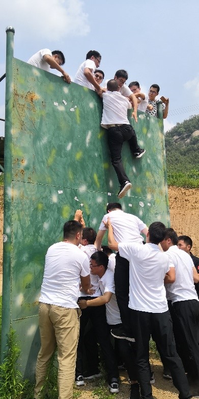 畢業(yè)墻:一面4.2米的高墻,不借助任何外界工具,在規(guī)定的時間內(nèi)全體人員完成逃生任務(wù)??此撇豢赡芡瓿傻娜蝿?wù),在教練的指導(dǎo)下大家迅速制定戰(zhàn)術(shù),通過搭建起層層人梯,人踩人、人舉人、人拉人的方式奮力拼搏,精誠合作在短短9分鐘完成了任務(wù)。當(dāng)最后一位隊友在大家的努力下成功翻越畢業(yè)墻的瞬間,雀躍的歡呼聲久久不散,這是一個看似不可能完成的任務(wù),卻在團隊的共同努力下有如此震撼的結(jié)果,團隊的力量,人梯奉獻的力量,給團隊的每一位成員都帶來極大的震撼和自豪,大家忘卻肩膀血痕累累的痛楚,忘卻克服高空經(jīng)歷的恐懼,記住了被一雙雙手托舉和拉拽的安全感,記住了團隊的強大。