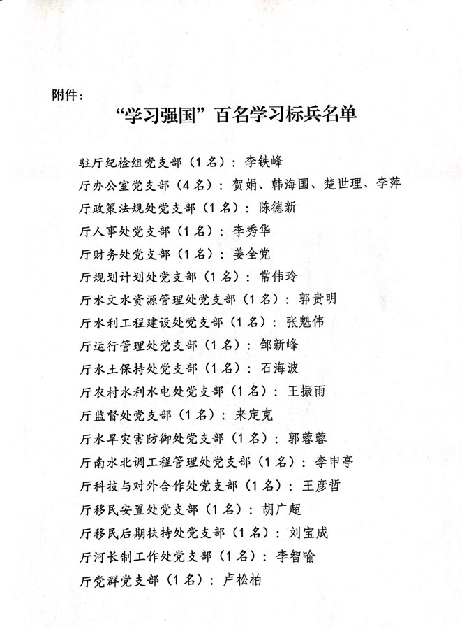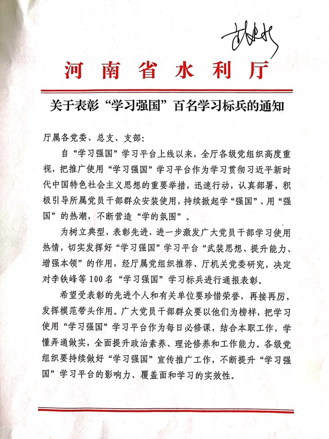 倡議全體黨員向標兵學習,積極主動用好“學習強國”平臺,以此為抓手,不斷用習近平總書記治國理政方略武裝頭腦,并學以致用,將所學用到我們的工作實踐,指導我們努力工作、奮勇開拓,為新時代水利改革發(fā)展作出更大的貢獻。