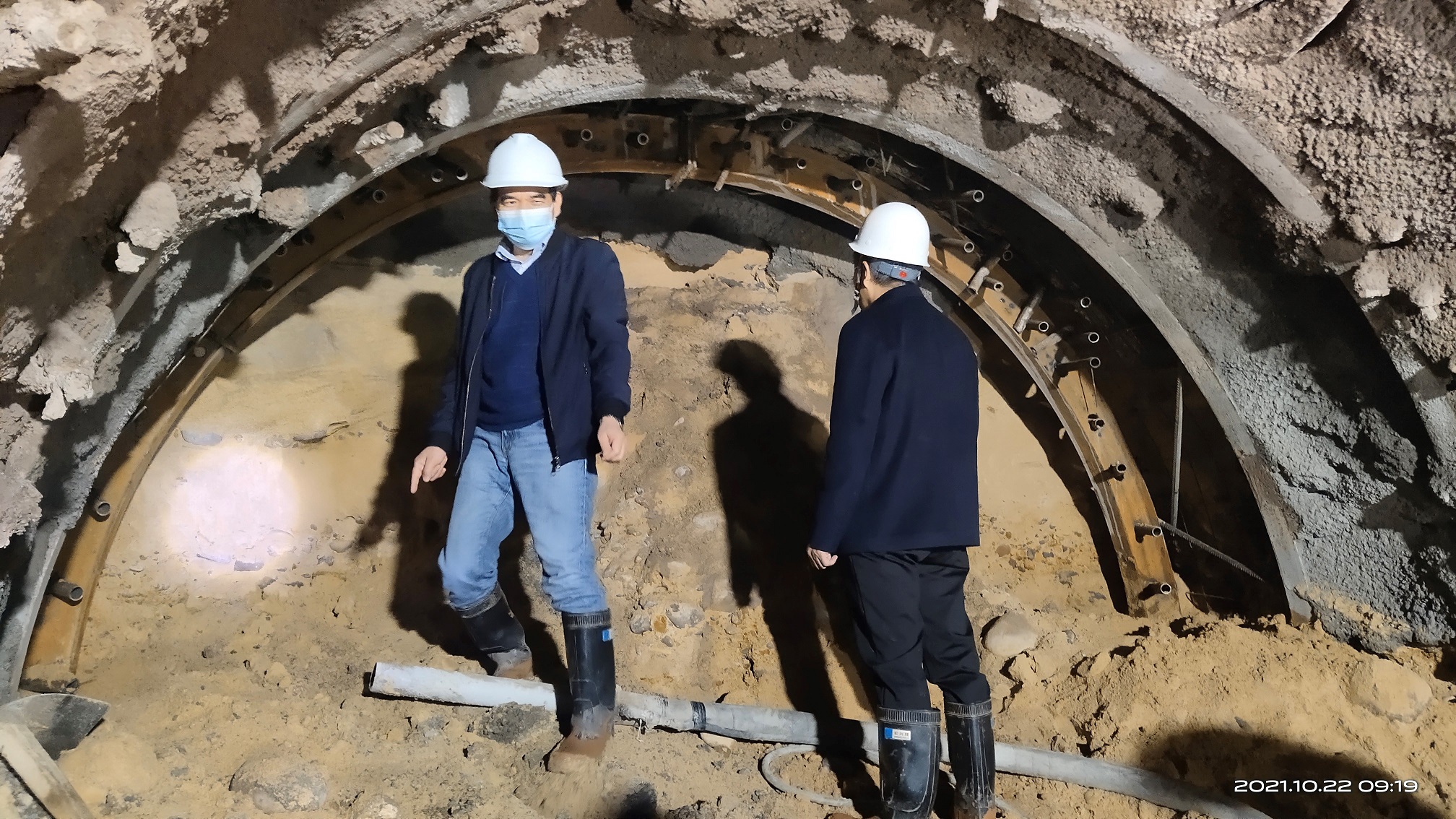 公司技術副總監(jiān)水淼(左)現(xiàn)場查看隧洞砂卵石地層坍塌問題