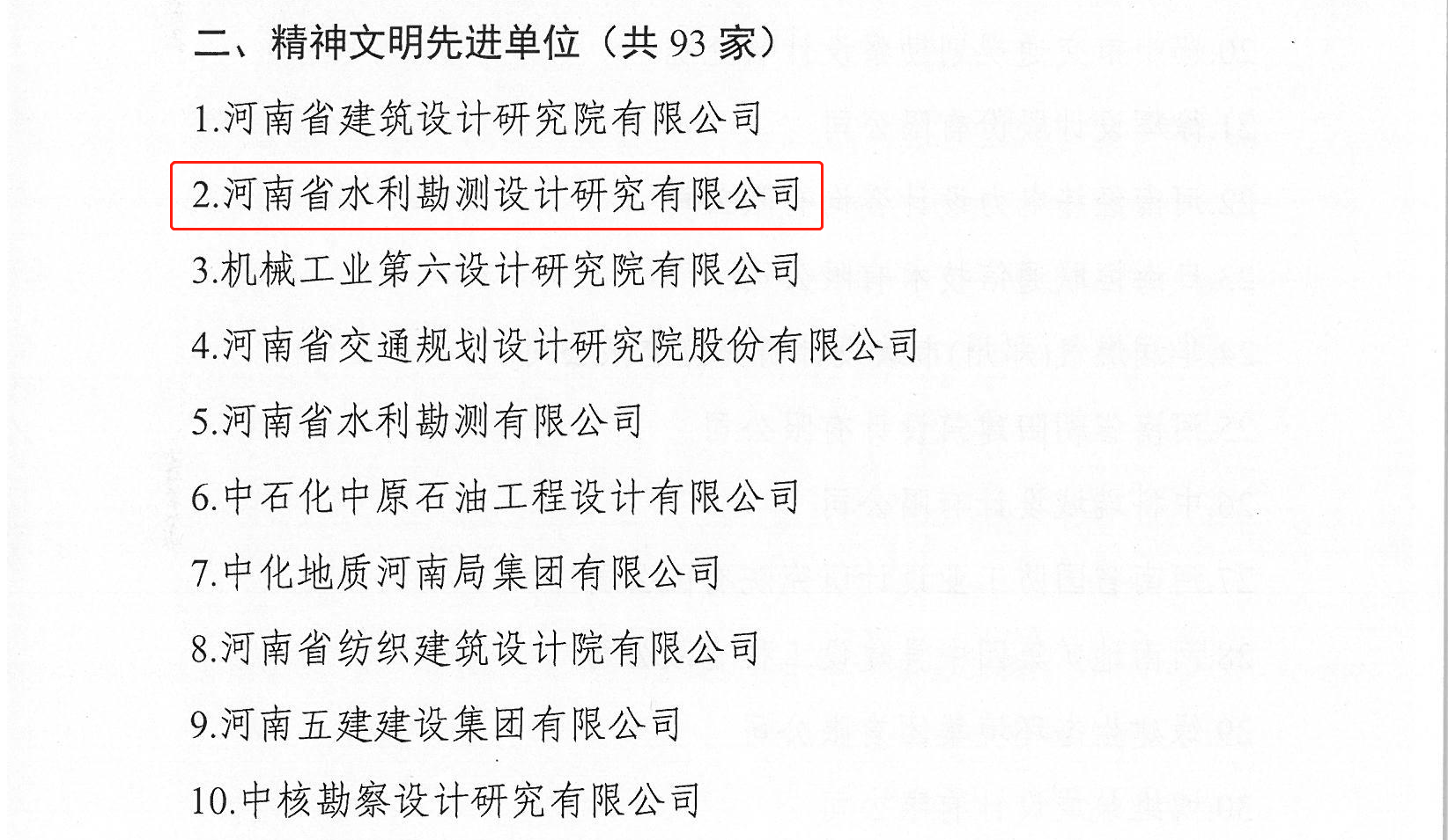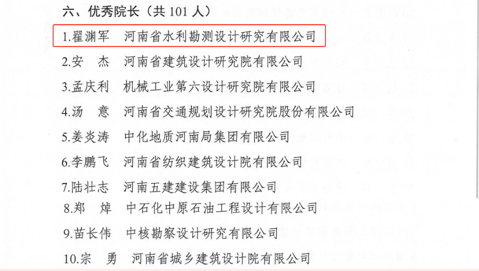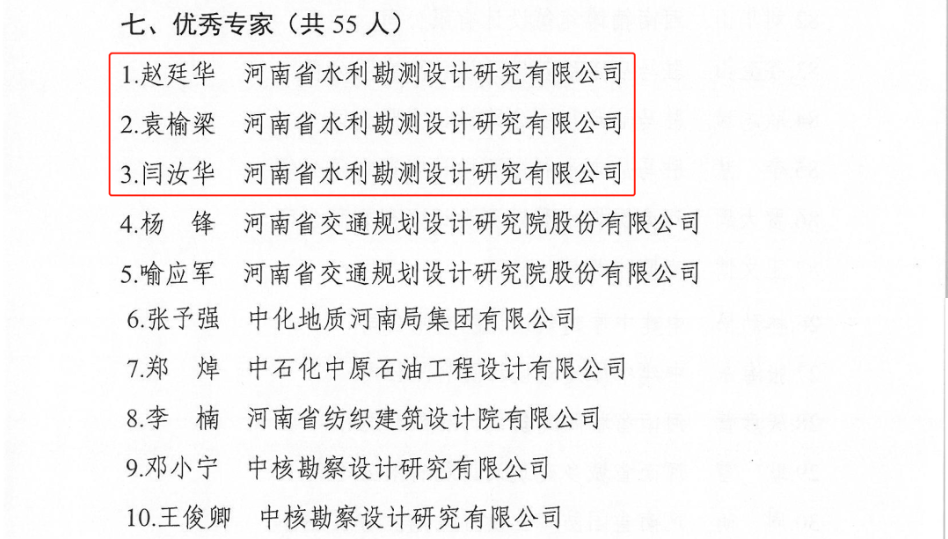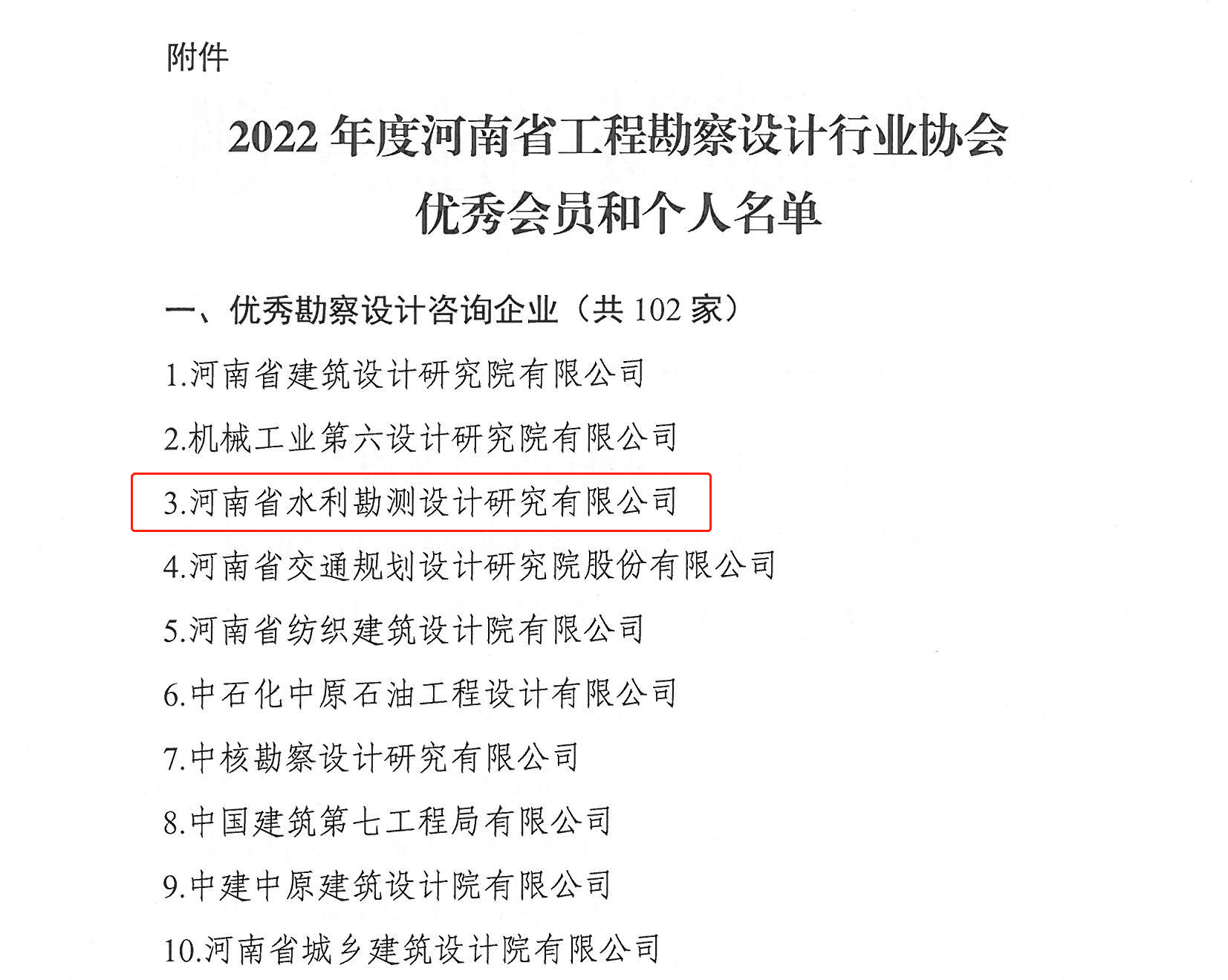 2月21日,由河南省工程勘察設(shè)計(jì)行業(yè)協(xié)會(huì)組織的“2022年度河南省工程勘察設(shè)計(jì)行業(yè)協(xié)會(huì)優(yōu)秀會(huì)員和個(gè)人名單”評(píng)選活動(dòng)公布結(jié)果,我公司榮獲“優(yōu)秀勘察設(shè)計(jì)咨詢企業(yè)”、“精神文明先進(jìn)單位”、“轉(zhuǎn)型發(fā)展標(biāo)桿企業(yè)”三項(xiàng)榮譽(yù)稱號(hào)。公司董事長(zhǎng)翟淵軍被授予“優(yōu)秀院長(zhǎng)”,公司副總經(jīng)理趙廷華、副總經(jīng)理袁榆梁、監(jiān)事會(huì)主席閆汝華3名同志被授予“優(yōu)秀專家”。