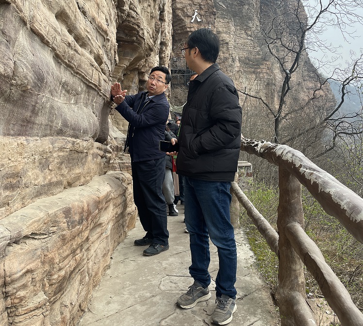 在青年洞,大家沿著“創(chuàng)業(yè)路”拾級(jí)而上,追憶著半個(gè)多世紀(jì)前先輩們?cè)诖藠^斗的足跡:在紅旗渠修建過程中,300名青年組成突擊隊(duì),經(jīng)過1年5個(gè)月的奮戰(zhàn),將地勢(shì)險(xiǎn)要、石質(zhì)堅(jiān)硬的巖壁鑿?fù)?,這個(gè)輸水隧洞被命名為青年洞。青年洞現(xiàn)場(chǎng),面對(duì)鮮艷的五星紅旗,全體黨員舉起右拳,在支部書記楊華軍的帶領(lǐng)下,重溫入黨誓詞,堅(jiān)定了我們緊跟總書記的步伐,奮進(jìn)新征程的信念和決心。