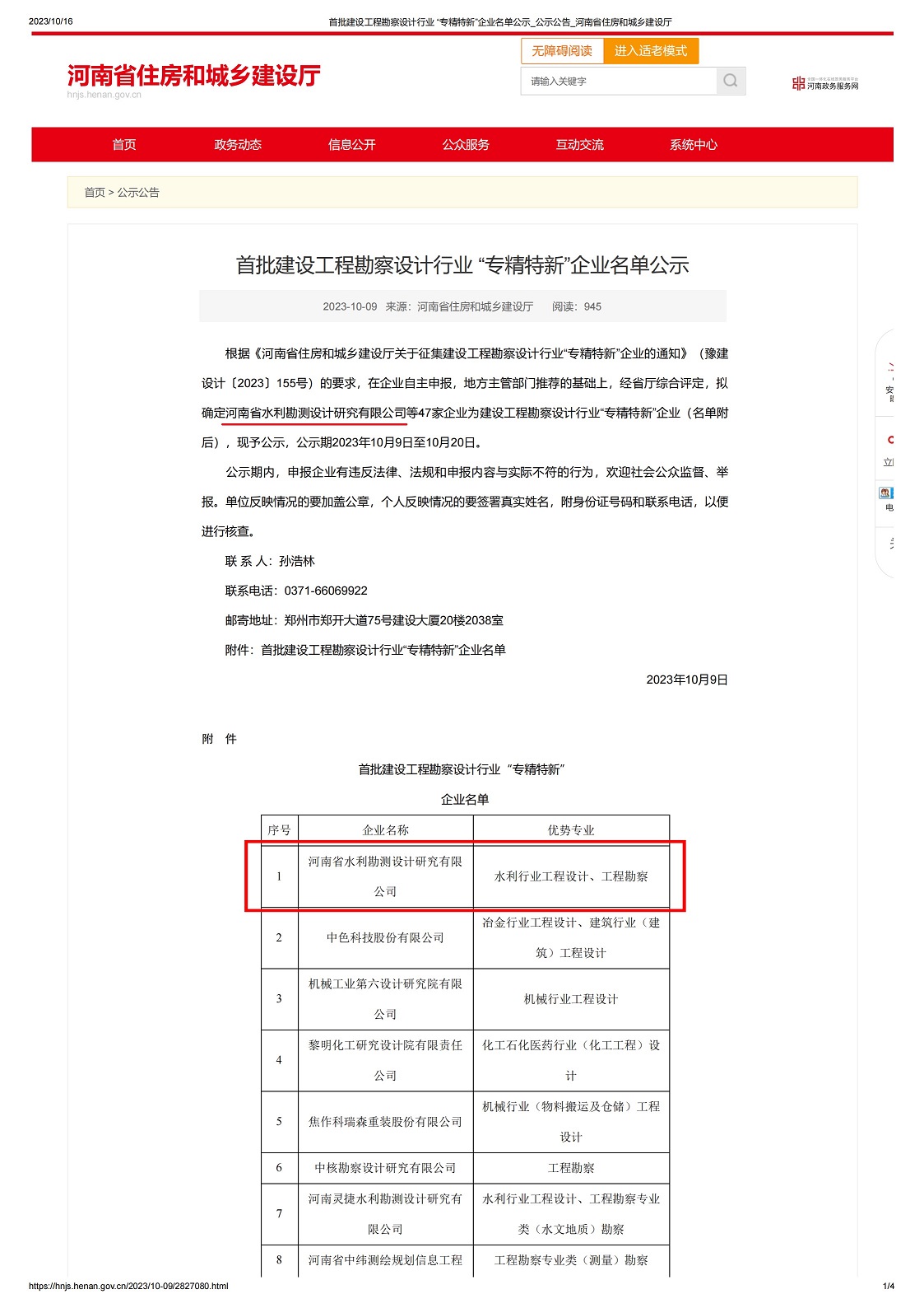 10月9日,河南省住建廳公示首批建設工程勘察設計行業(yè)專精特新企業(yè)名單,河南省內(nèi)僅47家勘察設計企業(yè)入選,我公司在眾多參評單位中脫穎而出,位列榜首。