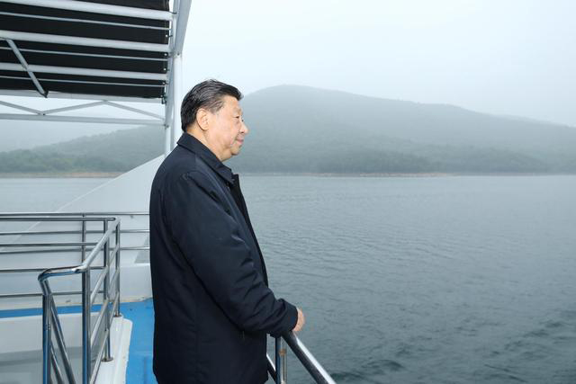習(xí)近平總書記佇立船頭,他的目光望向煙波浩渺的水、望向林木蔥郁的山。