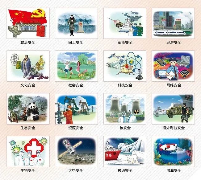 至此,我國國家安全領(lǐng)域主要包括:政治安全、國土安全、軍事安全、經(jīng)濟安全、文化安全、社會安全、科技安全、網(wǎng)絡(luò)安全、生態(tài)安全、資源安全、核安全、海外利益安全、生物安全、太空安全、極地安全、深海安全。