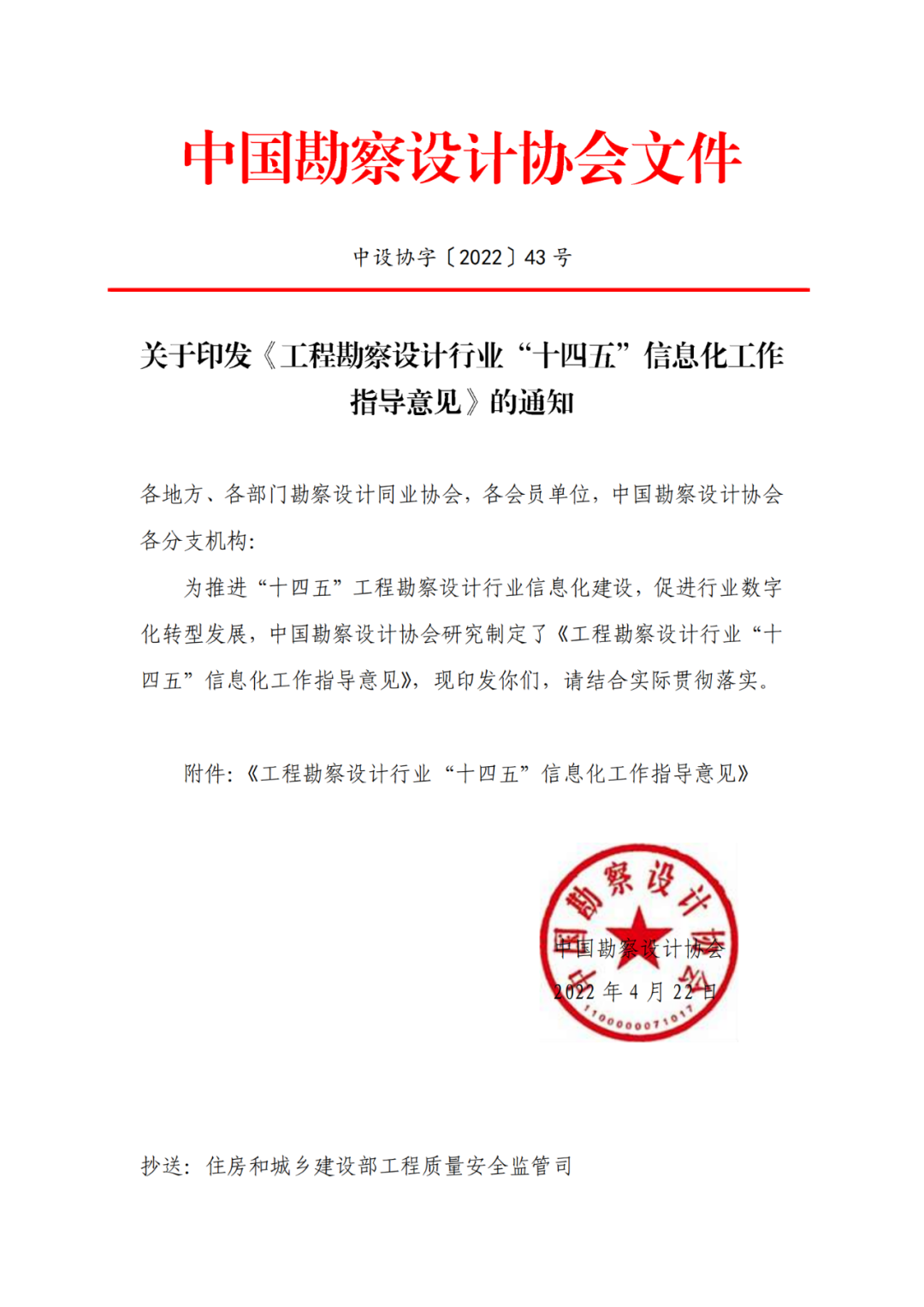 為推進(jìn)“十四五”工程勘察設(shè)計(jì)行業(yè)信息化建設(shè),促進(jìn)行業(yè)數(shù)字化轉(zhuǎn)型發(fā)展,中國(guó)勘察設(shè)計(jì)協(xié)會(huì)研究制定了《工程勘察設(shè)計(jì)行業(yè)“十四五”信息化工作指導(dǎo)意見》,并印發(fā)通知予以發(fā)布。