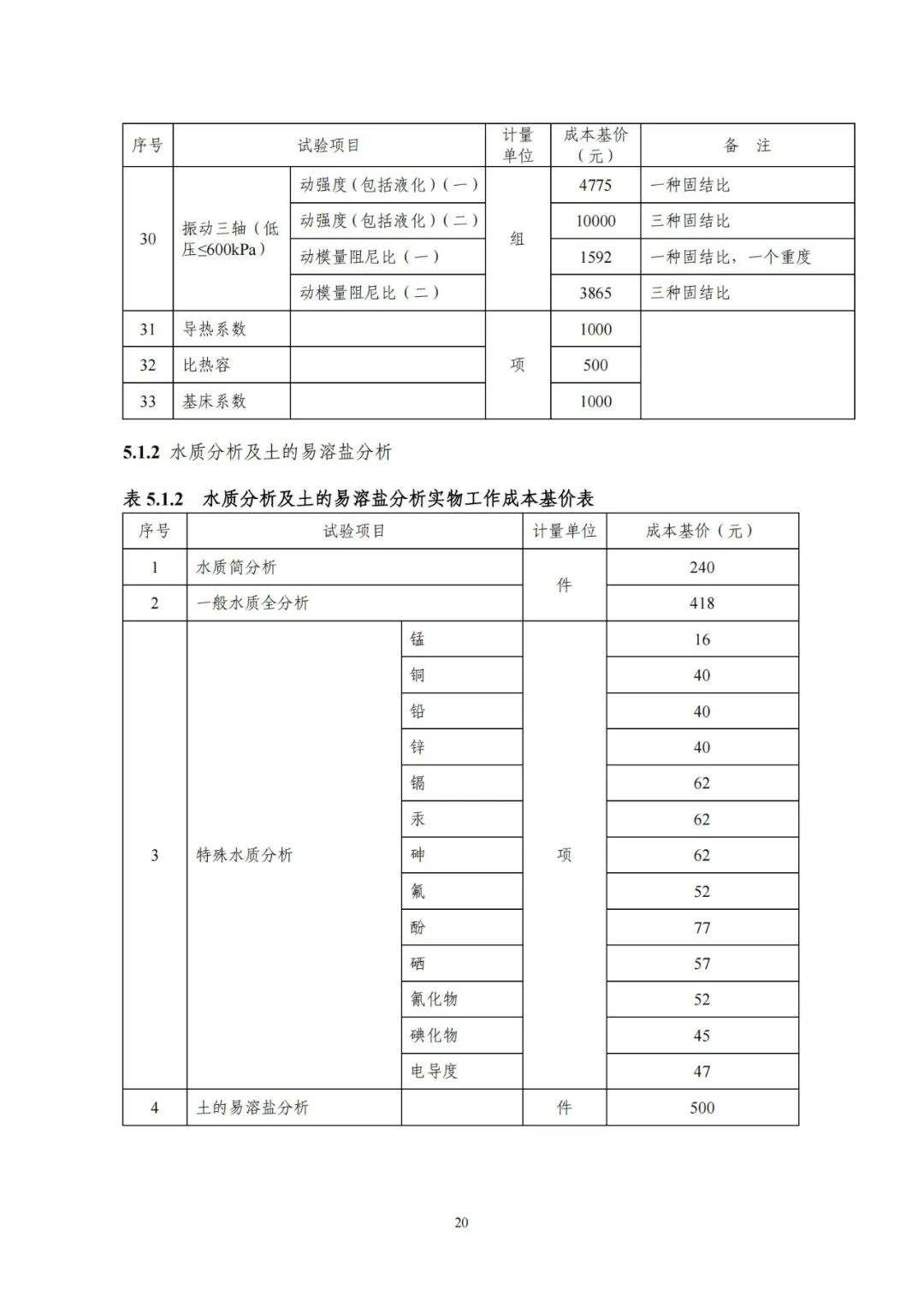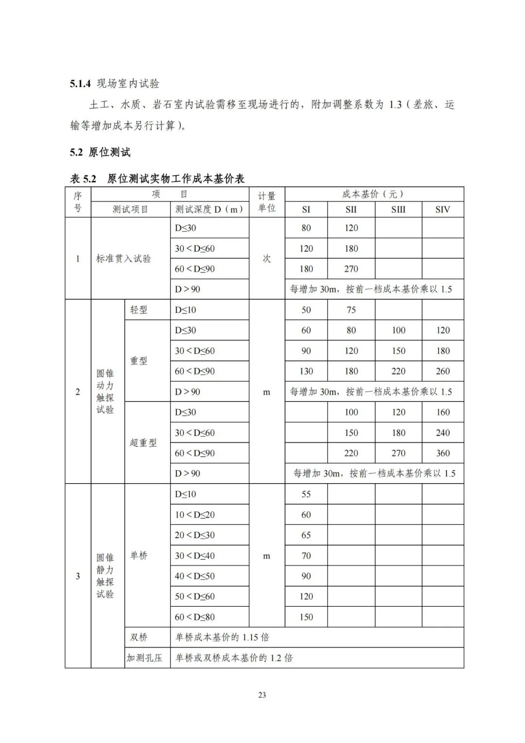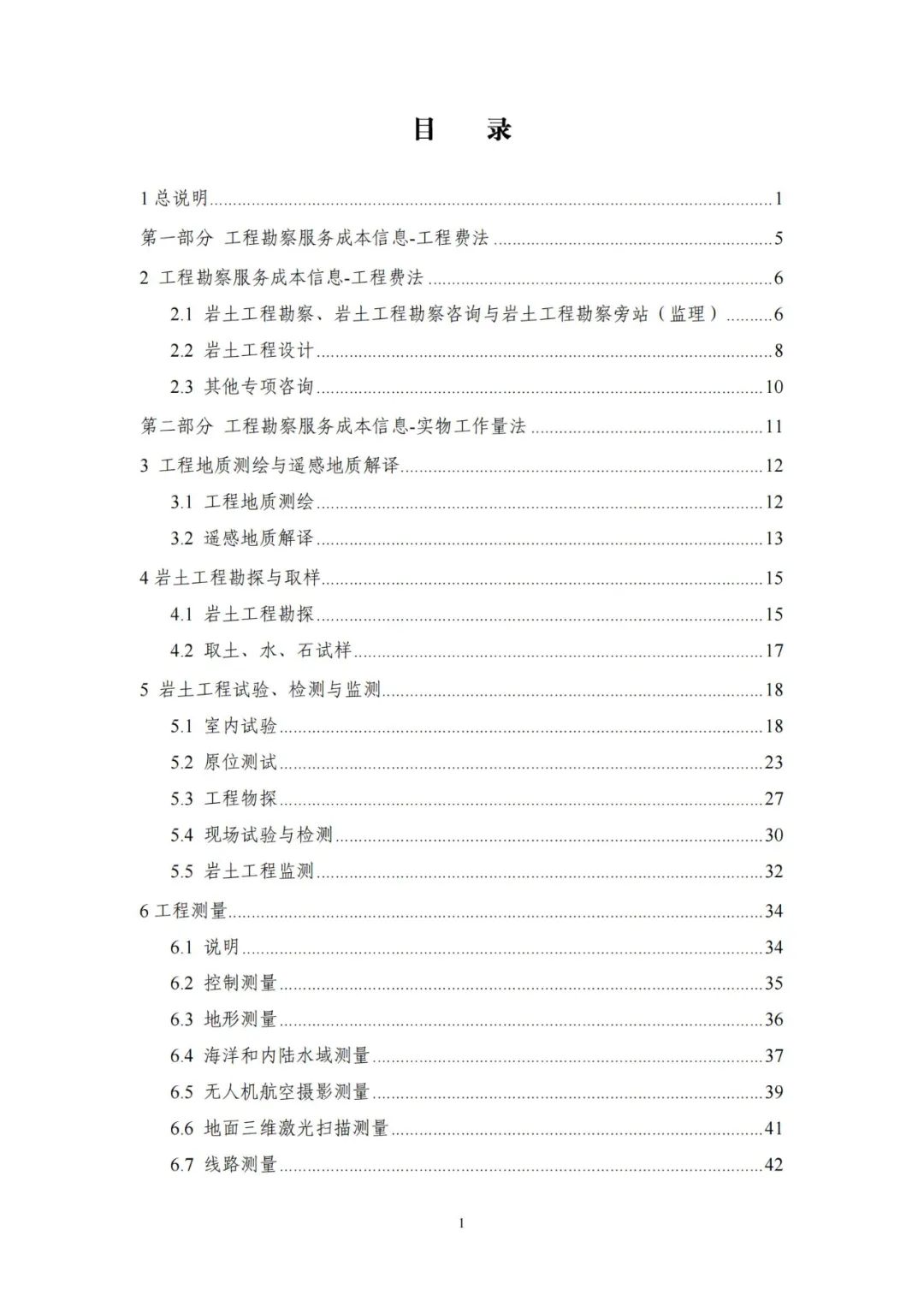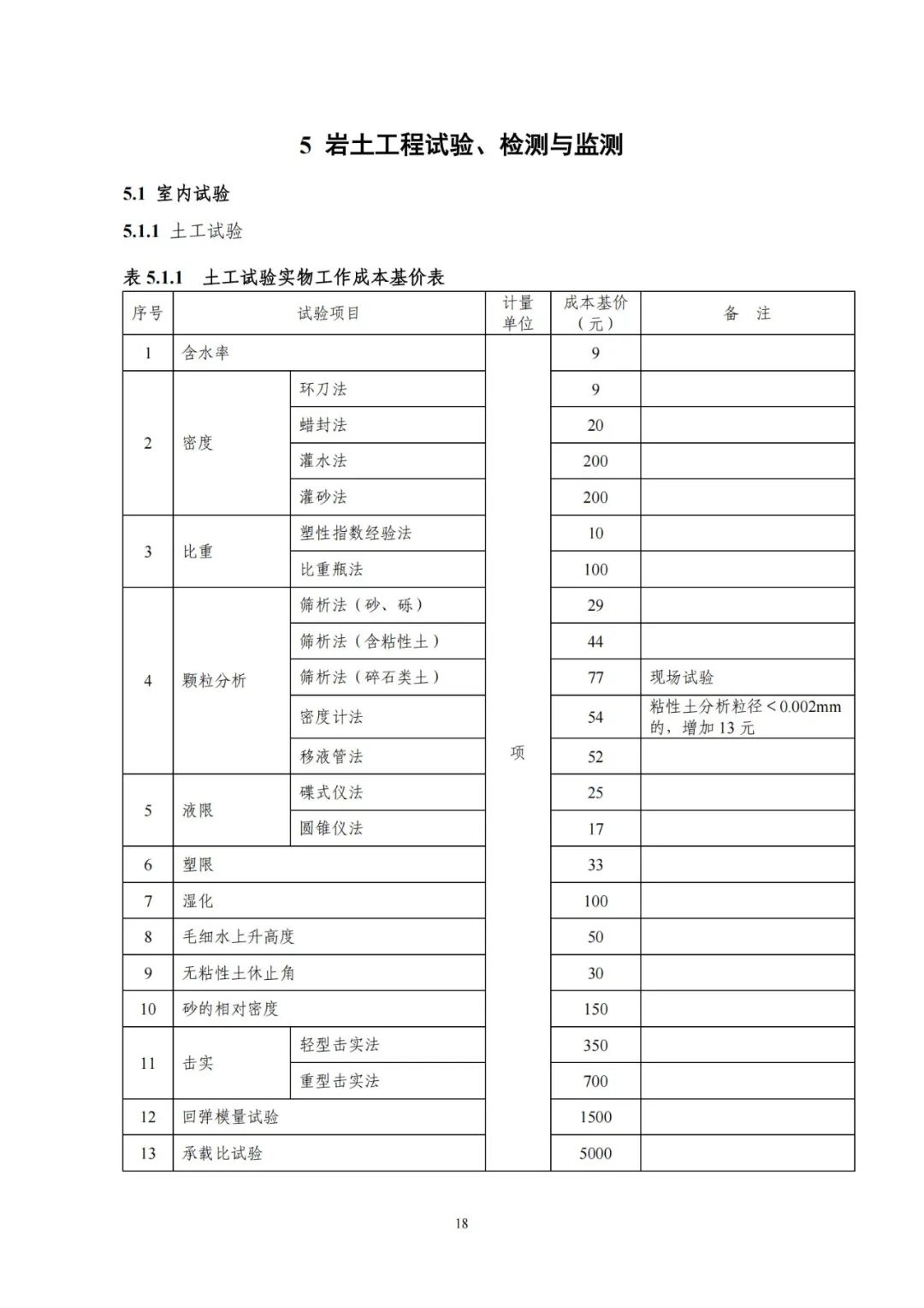 《要素信息》分為八章,相關成本測算分為工程費法(其包含巖土工程勘察、巖土工程勘察咨詢與監(jiān)理、巖土工程設計和專業(yè)工程咨詢)、實物工作量法(其包含工程地質測繪與遙感地質解譯、巖土工程勘探與取樣、巖土工程試驗/檢測與監(jiān)測、工程測量、水文地質勘察)及人工日法三類。除傳統的巖土工程試驗、測試和工程測量項目外,實物工作成本包括了土的易溶鹽及導熱系數等室內試驗、多功能數字式孔壓靜力觸探試驗、溫度測量等工程物探、海洋和內陸水域測量、無人機航空攝影測量、地面三維激光掃描測量、規(guī)劃測量等以新技術方法為主的專業(yè)技術服務項目。