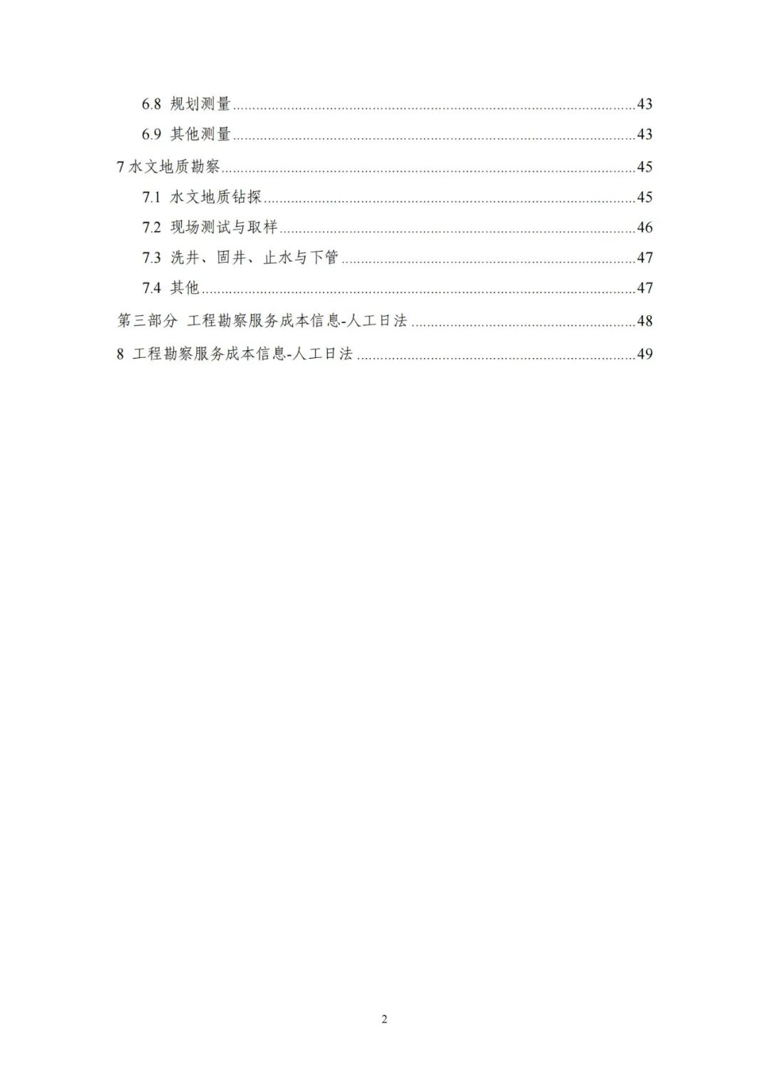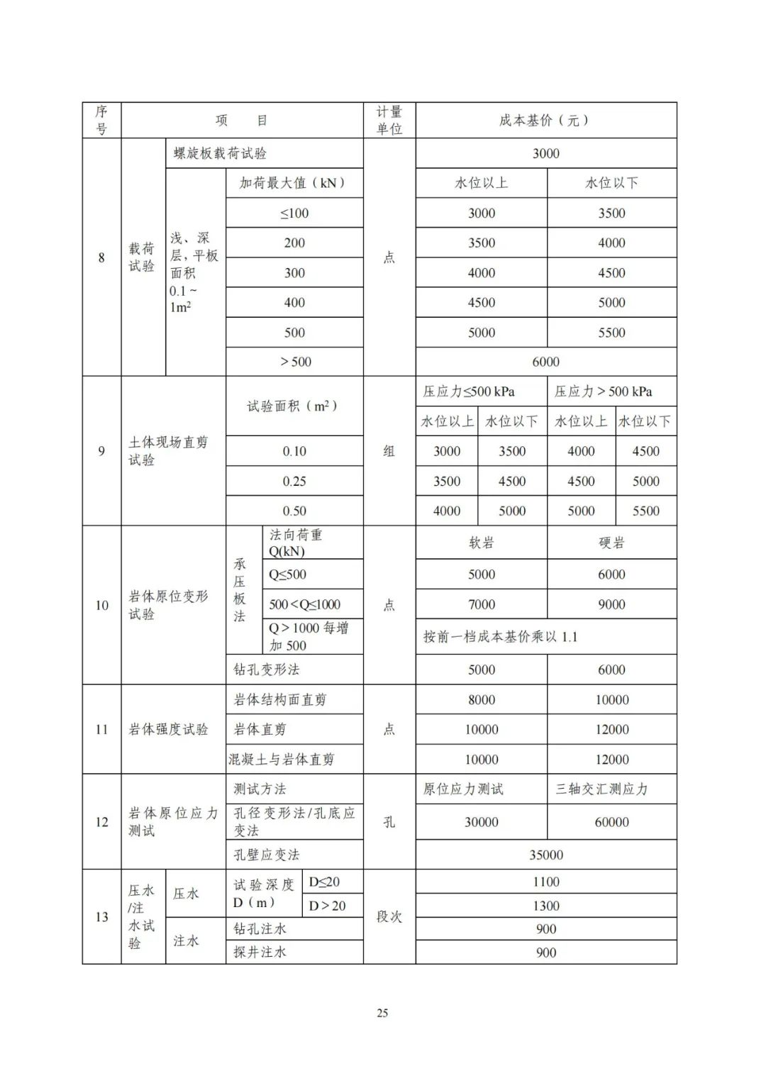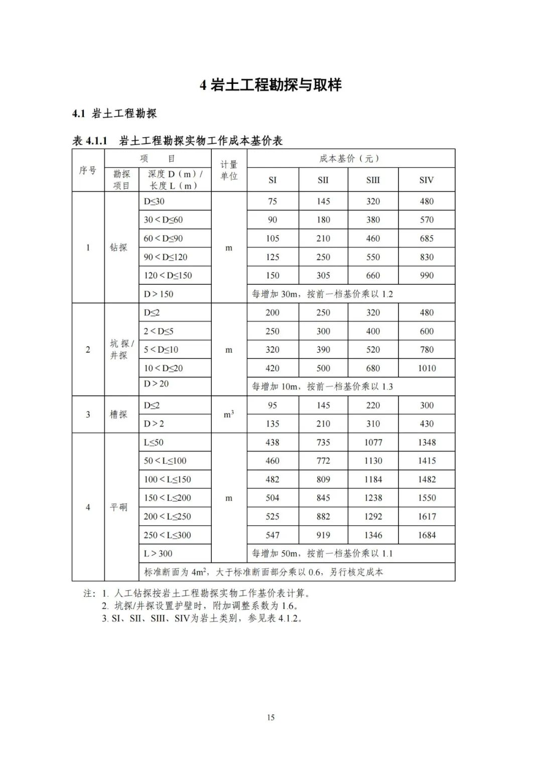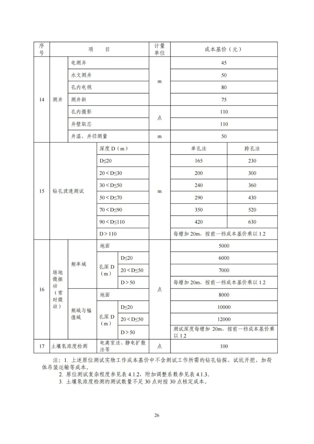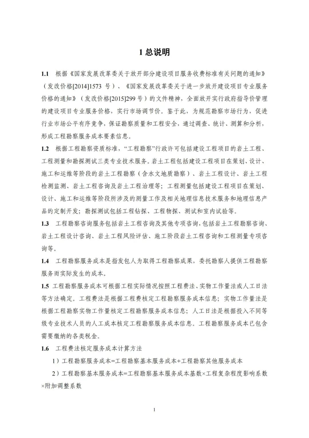 《要素信息》分為八章,相關成本測算分為工程費法(其包含巖土工程勘察、巖土工程勘察咨詢與監(jiān)理、巖土工程設計和專業(yè)工程咨詢)、實物工作量法(其包含工程地質測繪與遙感地質解譯、巖土工程勘探與取樣、巖土工程試驗/檢測與監(jiān)測、工程測量、水文地質勘察)及人工日法三類。除傳統的巖土工程試驗、測試和工程測量項目外,實物工作成本包括了土的易溶鹽及導熱系數等室內試驗、多功能數字式孔壓靜力觸探試驗、溫度測量等工程物探、海洋和內陸水域測量、無人機航空攝影測量、地面三維激光掃描測量、規(guī)劃測量等以新技術方法為主的專業(yè)技術服務項目。