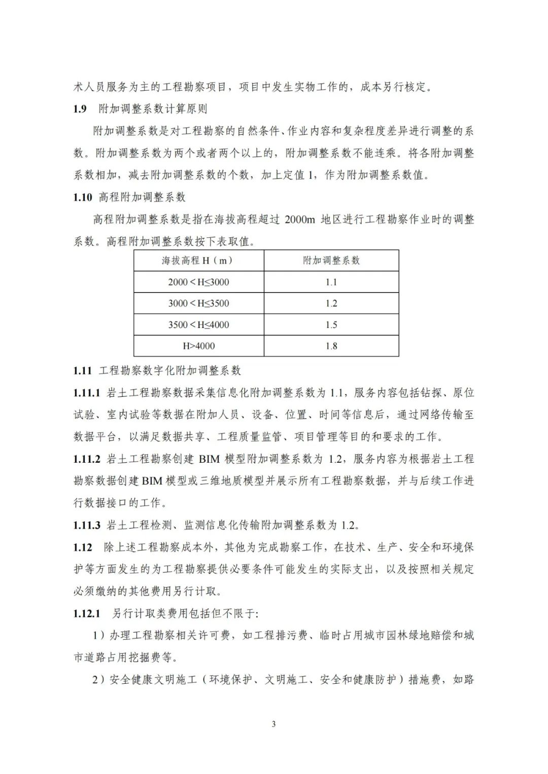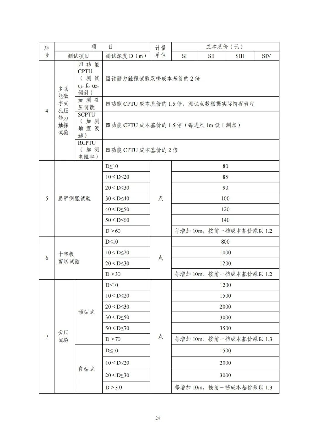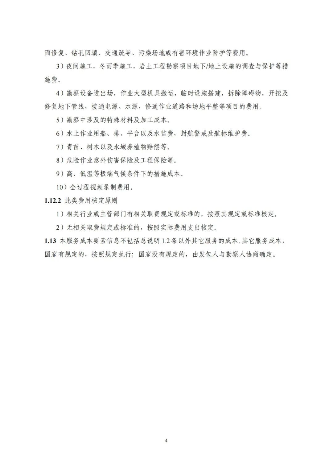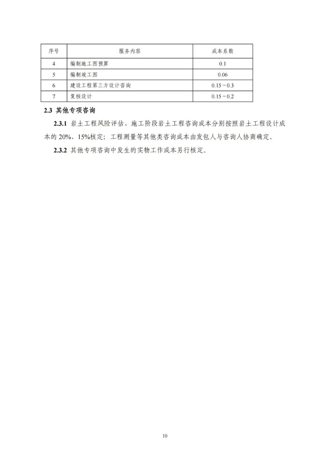 《要素信息》分為八章,相關成本測算分為工程費法(其包含巖土工程勘察、巖土工程勘察咨詢與監(jiān)理、巖土工程設計和專業(yè)工程咨詢)、實物工作量法(其包含工程地質測繪與遙感地質解譯、巖土工程勘探與取樣、巖土工程試驗/檢測與監(jiān)測、工程測量、水文地質勘察)及人工日法三類。除傳統的巖土工程試驗、測試和工程測量項目外,實物工作成本包括了土的易溶鹽及導熱系數等室內試驗、多功能數字式孔壓靜力觸探試驗、溫度測量等工程物探、海洋和內陸水域測量、無人機航空攝影測量、地面三維激光掃描測量、規(guī)劃測量等以新技術方法為主的專業(yè)技術服務項目。