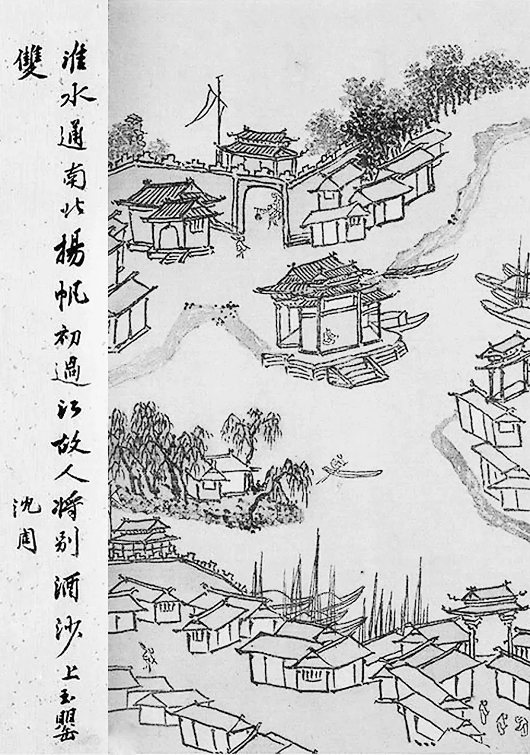 圖為明代畫(huà)家沈周的《兩江名勝圖冊(cè)》,題款:淮水通南北,揚(yáng)帆初過(guò)江。故人將別酒,沙上玉罌雙。